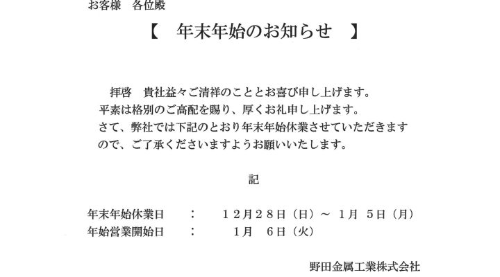 【 年末年始のお知らせ 】 拝啓 貴社益々ご清祥のこととお喜び申し上げます。 平素は格別のご高配を賜り、厚くお礼申し上げます。 さて、弊社では下記のとおり年末年始休業させていただきます ので、ご了承くださいますようお願いいたします。 記 年末年始休業日 : 12月28日(日)~ 1月・・・